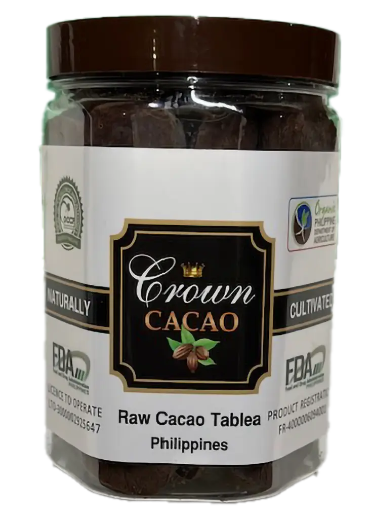 Crown Raw Cacao Tablea (100% Dark Chocolate) is processed with traditional natural fermentation & no heat applied to finished products in order to retained the rich Polyphenols & Flavanols in cacao beans. It is a healthy supplement.
